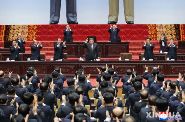 [평양=신화/뉴시스] 조선중앙통신(KCNA)이 23일 제공한 사진에 김정은 북한 국무위원장이 지난 22일 평양에서 열린 최고인민회의 제15기 제1차 회의에서 국무위원장으로 재추대되고 있다. 2026.03.24. [서울=뉴시스] 남빛나라 기자 = 통일부는 한국을 적대국으로 '공인'한다는 김정은 북한 국무위원장 연설에 대해 "기존의 적대적 두 국가 기조를 재확