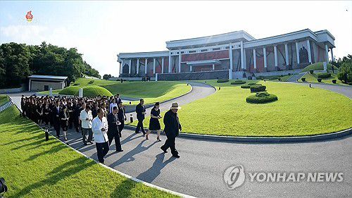(서울=연합뉴스) 김정은 국무위원장이 지난 24일 당·정부, 무력기관의 지도간부들과 함께 '반제계급교양의 거점'인 신천계급교양관을 돌아봤다고 조선중앙TV가 26일 보도했다. 김 위원장은 신천계급교양관의 전시실들과 사백어머니묘, 백둘어린이묘, 군당방공호, 화약창고 등 여러 곳을 둘러봤다. [조선중앙TV 화면] 2025.7.26 [국내에서만 사용가능. 재배포