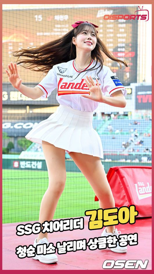 6일 오후 인천 SSG 랜더스 필드에서 ‘2025 신한 SOL BANK KBO리그’ SSG 랜더스와 삼성 라이온즈의 경기가 열렸다. SSG 김도아 치어리더가 단상 위에서 상큼한 공연을 펼치고 있다. 2025.08.06 / rumi@osen.co.kr