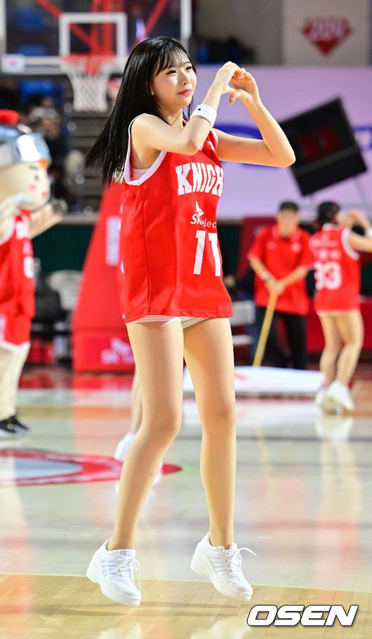 13일 오후 잠실학생체육관서 2025-2026 LG전자 프로농구 서울 SK 나이츠 와부산 KCC 이지스의 경기가 열렸다. SK는 연패 탈출을,KCC는 연승에 도전한다. SK 김주선 치어리더가 코트 위에서 응원을 펼치고 있다. 2025.10.13 /rumi@osen.co.kr