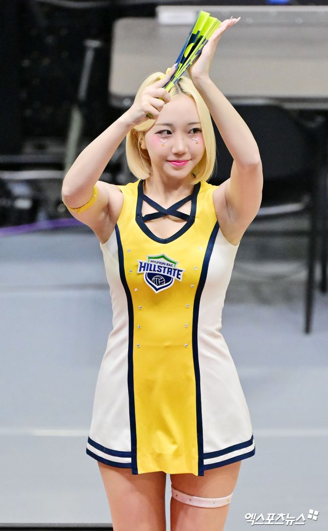 4일 오후 경기도 수원실내체육관에서 열린 진에어 2025-2026 V-리그 현대건설과 기업은행의 경기, 현대건설이 기업은행에 세트스코어 3:0(25-20 25-20 25-22)으로 승리했다. 현대건설 박성은 치어리더가 열띤 응원을 선보이고 있다. 김한준 기자 kowel@xportsnews.com