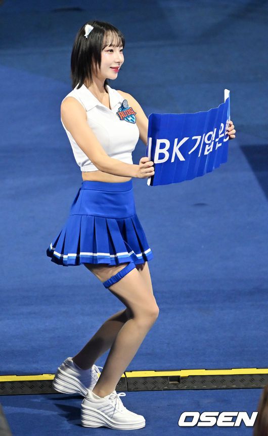 14일 오후 경기 화성종합실내체육관에서 ‘진에어 2025~2026 프로배구 V리그’ 여자부 IBK기업은행 알토스와 GS칼텍스 서울KIXX의 경기가 열렸다. 홈팀 IBK기업은행은 1승 5패 7위에, 어웨이팀 GS칼텍스는 3승 3패로 4위에 랭크되어 있다. IBK기업은행 정희정 치어리더가 응원을 하고 있다. 2025.11.14 / rumi@osen.co.kr
