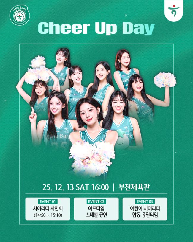 부천 하나은행이 13일 홈경기 ‘치어업데이’ 개최한다. 사진 | 부천 하나은행 부천 하나은행 여자농구단(구단주 이호성)은 오는 13일 오후 4시 부천체육관에서 열리는 용인 삼성생명과 홈경기를 ‘치어업데이’로 개최한다. 이번 ‘치어업데이’엔 하나은행 여자농구단의 연승을 기원하는 다양한 이벤트가 준비되어 있다. 먼저 하나은행 여자농구단의 치어리더(이주희, 박예