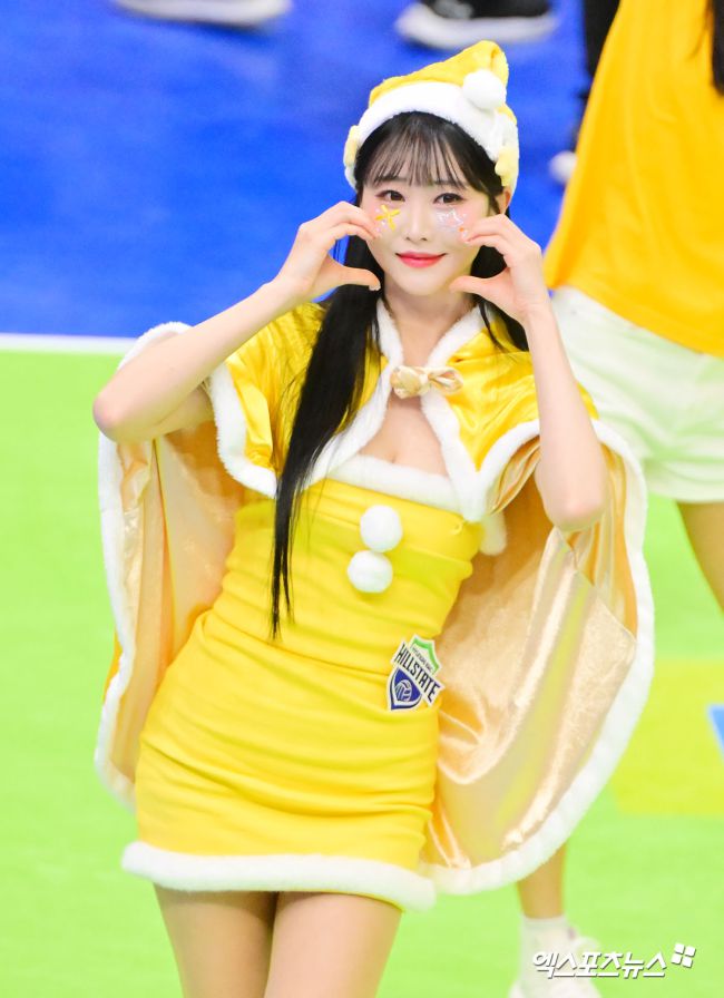 25일 오후 경기도 수원실내체육관에서 열린 '진에어 2025-2026 V-리그' 현대건설과 정관장의 경기, 정가예 치어리더가 멋진 공연을 선보이고 있다. 김한준 기자 kowel@xportsnews.com