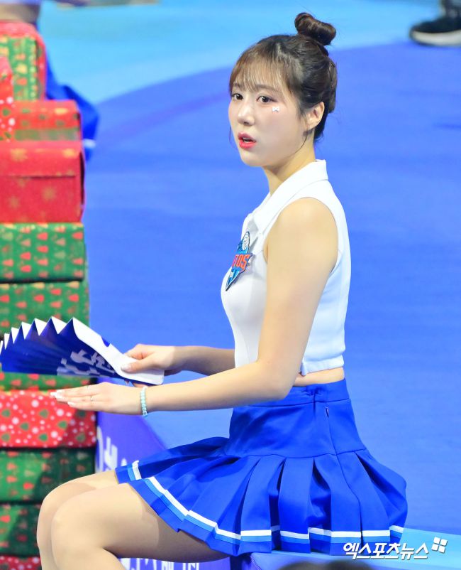 28일 오후 경기도 화성 종합실내체육관에 열린 '진에어 2025-2026 V-리그' IBK 기업은행과 정관장의 경기, 이금주 치어리더가 열띤 응원을 선보이고 있다. 김한준 기자 kowel@xportsnews.com