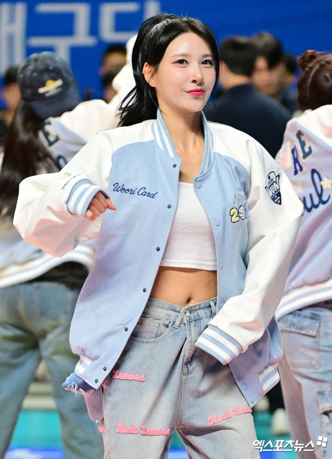 11일 오후 서울 장충체육관에서 열린 '진에어 2025-2026 V-리그' 우리카드와 KB손해보험의 경기, 원민주 치어리더가 멋진 공연을 선보이고 있다. 김한준 기자 kowel@xportsnews.com