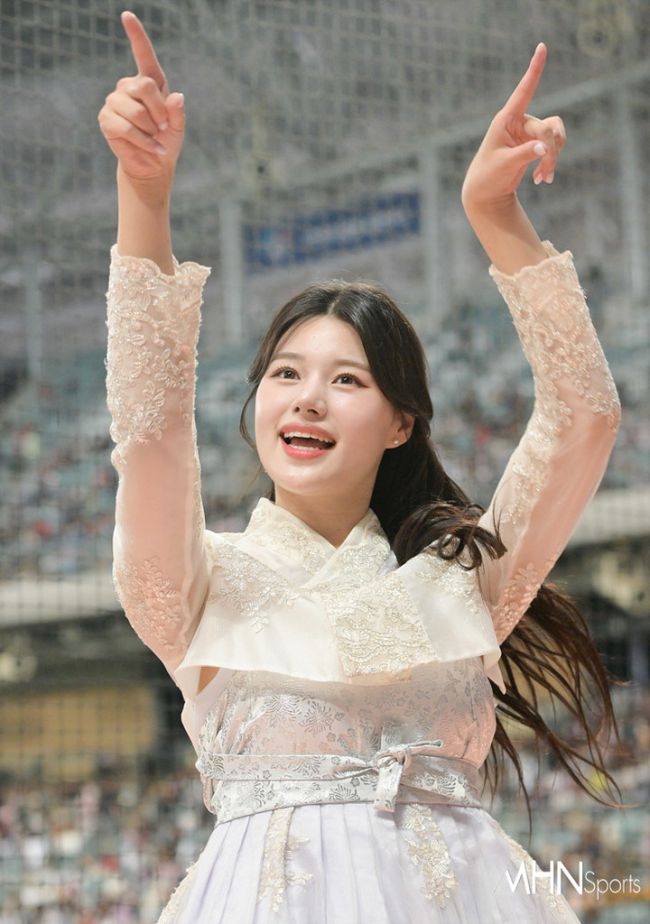 서울 구로구 고척스카이돔에서 '2023 신한은행 SOL KBO리그' KIA 타이거즈와 키움 히어로즈의 경기가 진행됐다. 키움 치어리더 이예빈이 추석 연휴 홈 경기에서 한복을 입고 열띤 응원전을 펼치고 있다.