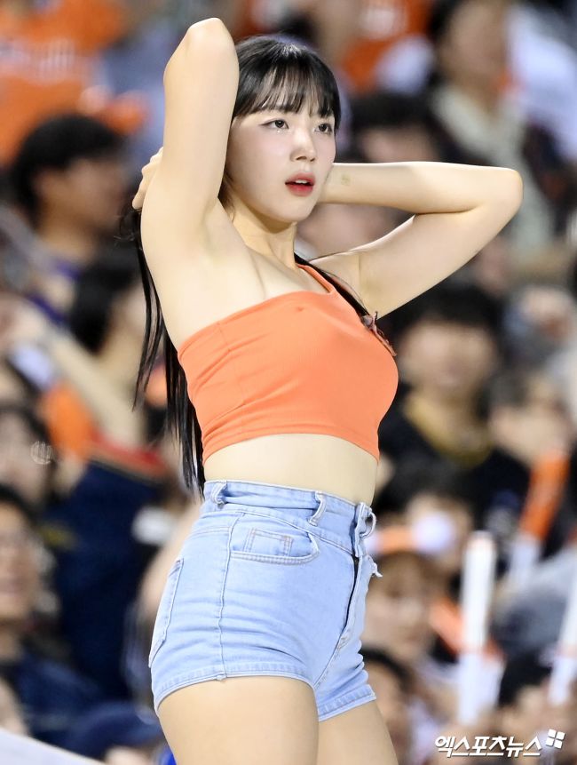 13일 오후 서울 송파구 잠실야구장에서 열린 '2024 신한 SOL Bank KBO리그' 한화 이글스와 두산 베어스의 경기, 하지원 치어리더가 열띤 응원을 선보이고 있다. 김한준 기자 kowel@xportsnews.com