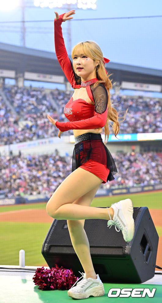 15일 서울 잠실야구장에서 2025 신한 SOL Bank KBO리그 LG 트윈스와 삼성 라이온즈의 경기가 열렸다. 이 경기에서 LG가 삼성에 3-0으로 승리했다. 역대 4번째 팀 노히트를 달성했다. LG 임혜진 치어리더가 화려한 공연을 펼치고 있다. 2025.04.15 / rumi@osen.co.kr
