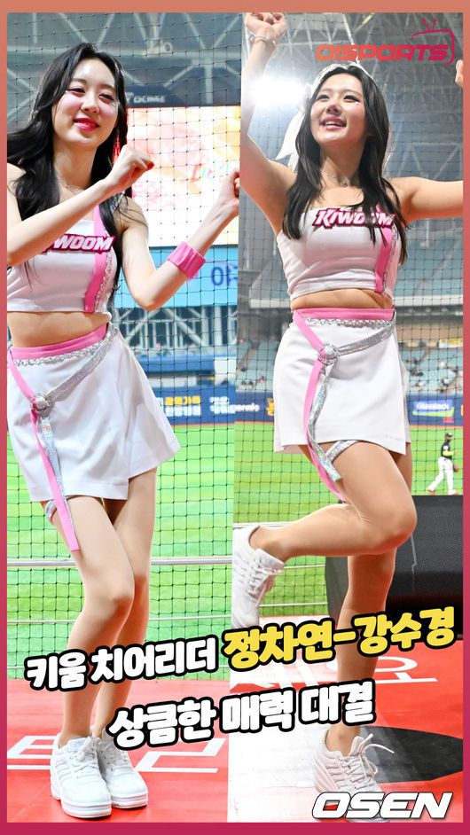 18일 오후 서울 고척스카이돔에서 ‘2025 신한 SOL BANK KBO리그’ 키움 히어로즈와 KT 위즈의 경기가 진행됐다. 키움 정차연 치어리더와 강수경 치어리더가 공연을 펼치고 있다. 2025.04.18 / rumi@osen.co.kr