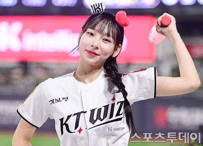 2025 신한은행 SOL Bank KBO리그 SSG 랜더스와 KT 위즈의 경기가 23일 수원시 수원KT 위즈파크에서 열렸다. KT 치어리더 정희정이 신나는 응원을 선보이고 있다. 2025.04.23. [스포츠투데이 권광일 기자 sports@stoo.com]