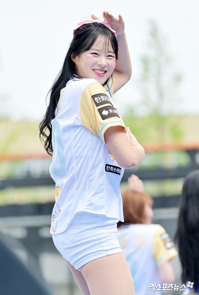 17일 오후 대전 한화생명 볼파크에서 열린 '2025 신한 SOL Bank KBO리그' SSG 랜더스와 한화 이글스의 더블헤더 1차전 경기, 이호은 치어리더가 멋진 공연을 선보이고 있다. 김한준 기자 kowel@xportsnews.com