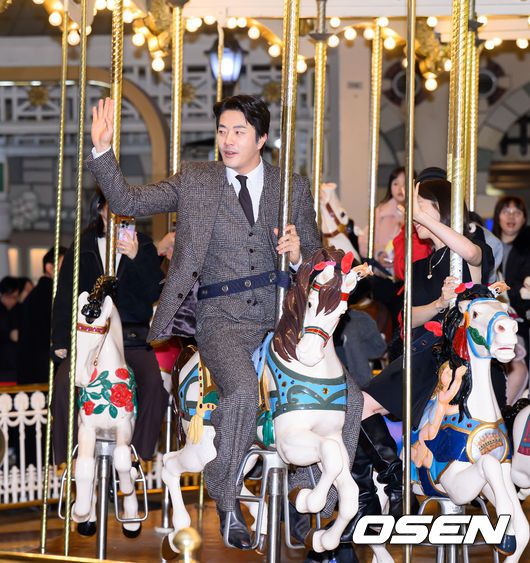 8일 오후 서울 잠실 롯데월드 회전목마에서 영화 '하트맨' 팬 이벤트가 열렸다. ‘하트맨’은 돌아온 남자 승민(권상우)이 다시 만난 첫사랑을 놓치지 않기 위해 고군분투하지만, 그녀에게 절대 말할 수 없는 비밀이 생기며 벌어지는 코미디로 오는 14일 전국 극장에서 개봉한다. 배우 권상우, 문채원이 포토타임을 하고 있다. 2026.01.08 /sunday@os