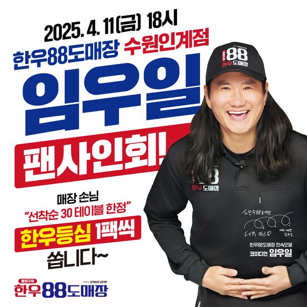한우·한돈 가성비 소고기집 '한우88도매장'이 전속 모델인 개그맨 임우일의 팬사인회를 오는 4월 11일 한우88도매장 수원인계점에서 진행한다고 5일 밝혔다. 팬사인회는 4월 11일(금) 18시부터 약 1시간 동안 수원시 인계동 수원시청역 6번 출구에서 도보 300m 거리에 위치한 한우88도매장 수원인계점에서 진행되며, 사인회 당일 매장 오픈 시간부터 매장