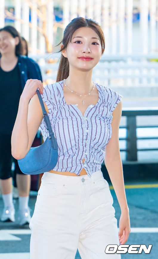그룹 우아(WOOAH)가 26일 오전 인천국제공항을 통해 해외 일정 참석차 출국했다. 이날 그룹 우아(WOOAH- 나나, 우연, 소라, 루시, 민서)는 해외 팬사인회 일정 참석 차 중국 상하이로 출국했다. 우아 민서가 출국길에 포즈를 취하고 있다. 2025.07.26 / rumi@osen.co.kr