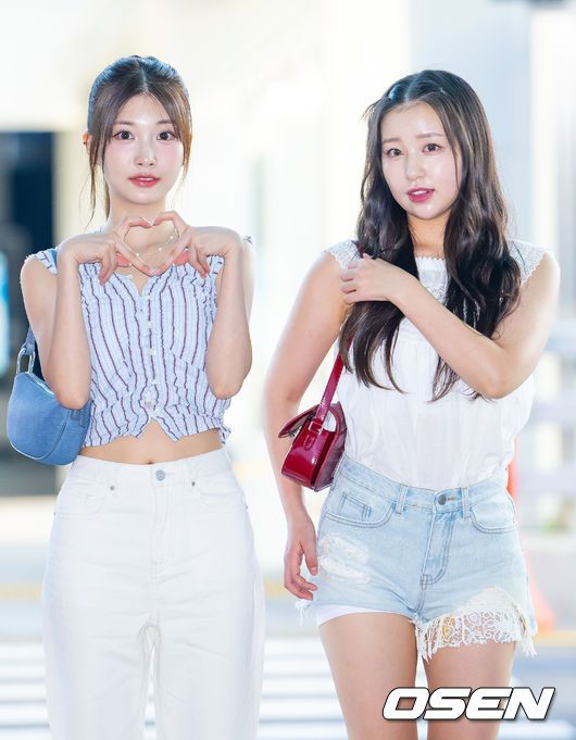 그룹 우아(WOOAH)가 26일 오전 인천국제공항을 통해 해외 일정 참석차 출국했다. 이날 그룹 우아(WOOAH- 나나, 우연, 소라, 루시, 민서)는 해외 팬사인회 일정 참석 차 중국 상하이로 출국했다. 우아 민서와 소라가 출국길에 포즈를 취하고 있다. 2025.07.26 / rumi@osen.co.kr
