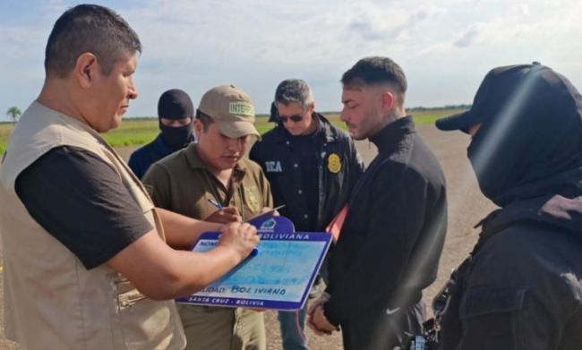 [서울신문 나우뉴스] 볼리비아 경찰이 검거한 마약두목 마르셋(가운데 검은 옷을 입은 남성)이 신병을 미국에 넘기고 있다. 에페 캡처 승용차보다 많은 비행기를 보유하고 있던 거물급 마약 카르텔 두목의 재산 규모에 관심이 집중되고 있다. 볼리비아 언론은 17일(현지시간) “볼리비아에서 검거돼 미국으로 신병이 인도된 마약 카르텔 두목 세바스티안 마르셋의 재산 중