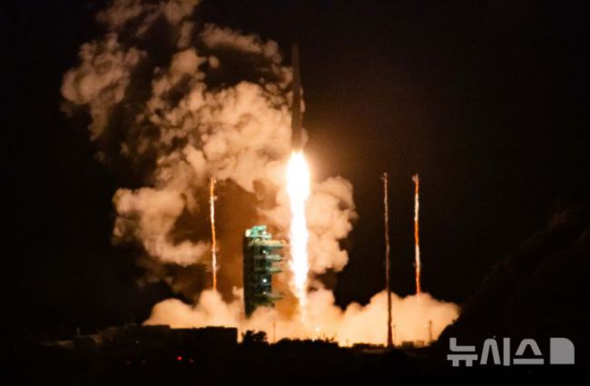 [여수=뉴시스] 황준선 기자 = 한국형 발사체 누리호가 27일 새벽 전남 고흥군 나로우주센터에서 발사되고 있다. 민간 기업인 한화에어로스페이스가 기술 이전을 통해 발사체 제작 전 과정을 주관한 누리호 4호기는 오로라·대기광 관측과 우주 자기장·플라스마 측정 등을 위한 위성 13기가 탑재됐다. 2025.11.27. hwang@newsis.com [서울=뉴시스