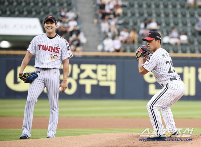 5일 서울 잠실구장에서 열린 두산-LG전. 피지컬100우승자 마선호의 시구 동작에 손주영이 미소짓고 있다. 잠실=정재근 기자 cjg@sportschosun.com/2025.8.5/ 5일 서울 잠실구장에서 열린 두산-LG전. 피지컬100우승자 마선호의 시구 동작에 손주영이 미소짓고 있다. 잠실=정재근 기자 cjg@sportschosun.com/2025.8.5