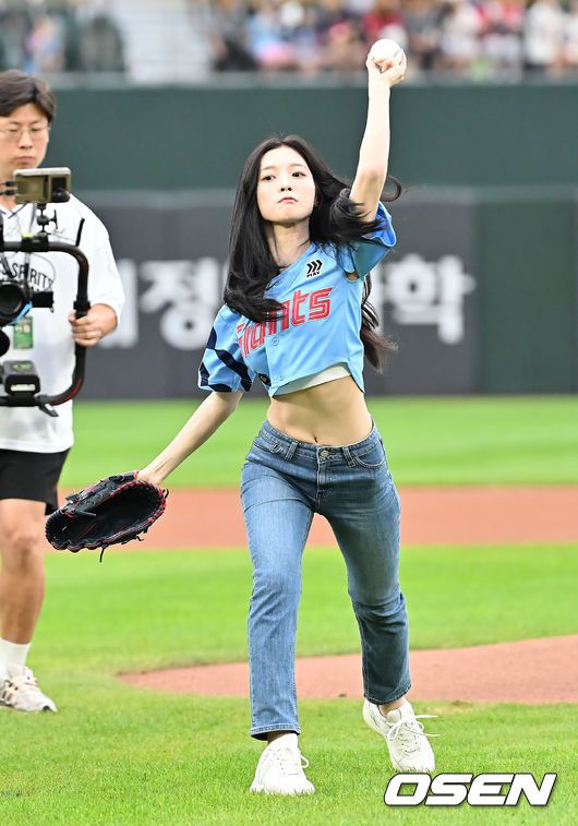 10일 부산 사직야구장에서 2025 신한 SOL 뱅크 KBO 리그 롯데 자이언츠와 SSG 랜더스의 경기가 열렸다. 홈팀 롯데는 박세웅이, 방문팀 SSG는 김건우가 선발 출전했다. 걸그룹 오마이걸 출신 배우 아린이 롯데 자이언츠 승리 기원 시구를 하고 있다. 2025.08.10 / foto0307@osen.co.kr