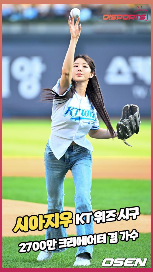 10일 오후 수원 KT위즈파크에서 ‘2025 신한 SOL BANK KBO리그’ KT 위즈와 삼성 라이온즈의 경기가 진행됐다. 경기 전 인플루언서 시아지우가 시구를 하고 있다. 시아지우는 틱톡에서 약 2,700만 명, 인스타그램 약 370만, 유튜브 약 90만명의 팔로워를 보유한 대한민국을 대표하는 크리에이터 겸 가수이다. 2025.08.10 / rumi@o