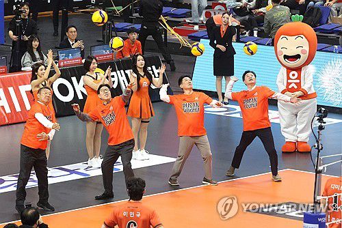(부산=연합뉴스) 강선배 기자 = 9일 부산 강서체육관에서 열린 프로배구 V리그 남자부 OK저축은행 읏맨과 대한항공 점보스의 경기. 참석 내빈들이 시구하고 있다. 2025.11.9 sbkang@yna.co.kr ▶제보는 카카오톡 okjebo ▶연합뉴스 앱 지금 바로 다운받기~ ▶네이버 연합뉴스 채널 구독하기 <저작권자(c) 연합뉴스, 무단 전재-재배포, A