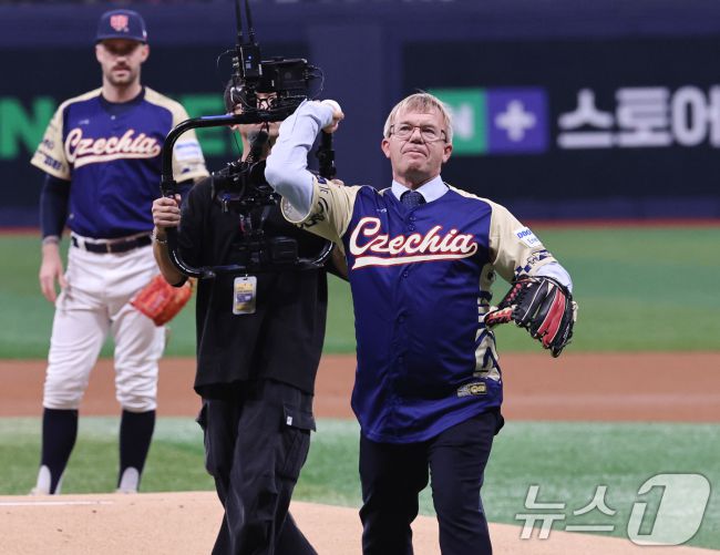 (서울=뉴스1) 구윤성 기자 = 9일 오후 서울 구로구 고척스카이돔에서 열린 2026 WBC 대비 평가전 '2025 네이버 K-베이스볼 시리즈(K-BASEBALL SERIES)' 체코와의 2차전 경기. 피터 디트리치 체코야구협회(CBA) 회장이 시구하고 있다. 2025.11.9/뉴스1 kysplanet@news1.kr Copyright ⓒ 뉴스1. All