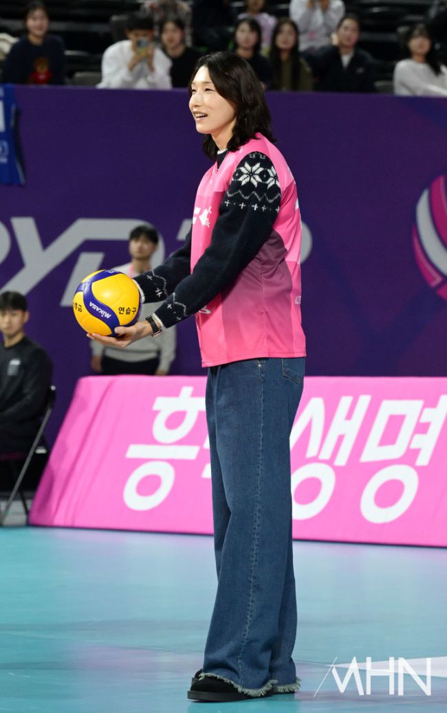 24일 오후 인천 삼산체육관에서 진에어 2025-2026 V리그 여자부 흥국생명과 IBK기업은행의 경기가 열렸다. 이날 김연경 흥국생명 어드바이저가 시구를 하고 있다.