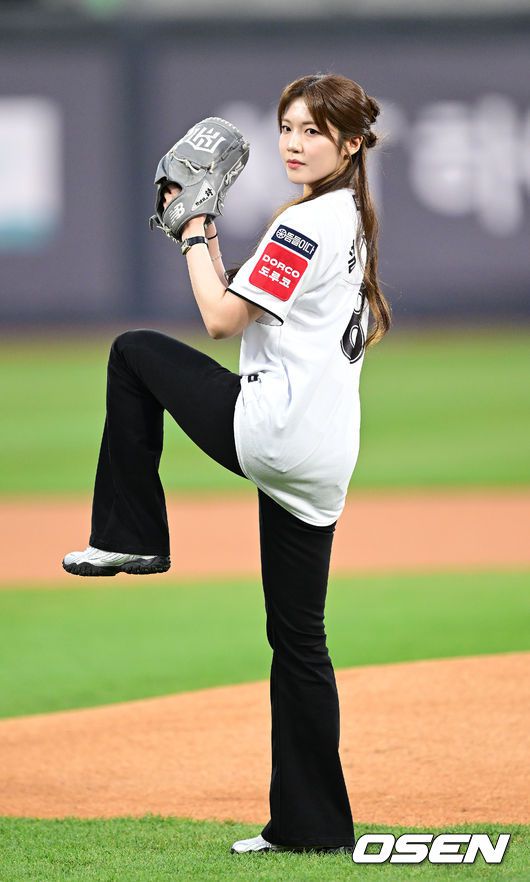 26일 오후 경기도 수원 KT위즈파크에서 ‘2025 신한 SOL Bank KBO리그’ KT 위즈와 두산 베어스의 경기가 열렸다. 홈팀 KT는 소형준, 방문팀 두산은 최승용을 선발로 내세웠다. 동계아시안게임 컬링 금메달리스트 설예은이 시구자로 나서 공을 던지고 있다. 2025.03.26 / dreamer@osen.co.kr