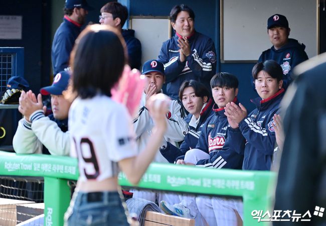 29일 오후 서울 송파구 잠실야구장에서 열린 '2025 신한 SOL Bank KBO리그' 삼성 라이온즈와 두산 베어스의 경기, 경기 전 두산 선수들이 시구를 마친 베이비몬스터 아현에게 박수를 보내고 있다. 김한준 기자 kowel@xportsnews.com