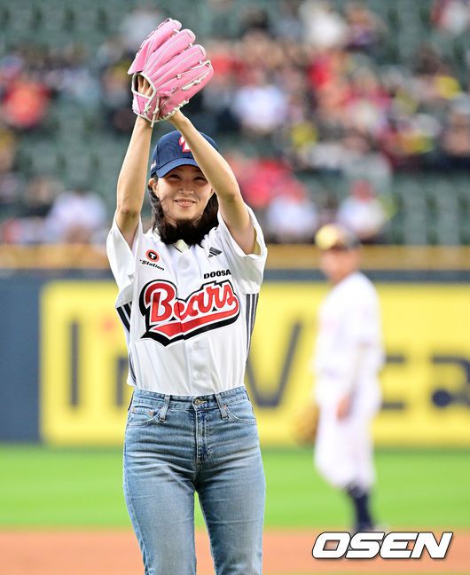 19일 오후 서울 잠실구장에서 2025 신한 SOL뱅크 KBO리그 두산 베어스와 KIA 타이거즈의 경기가 열렸다. 이날 두산은 최원준, KIA는 아담 올러를 선발로 내세웠다. 강지영 아나운서가 시구를 하고 있다. 2025.04.19 / jpnews@osen.co.kr