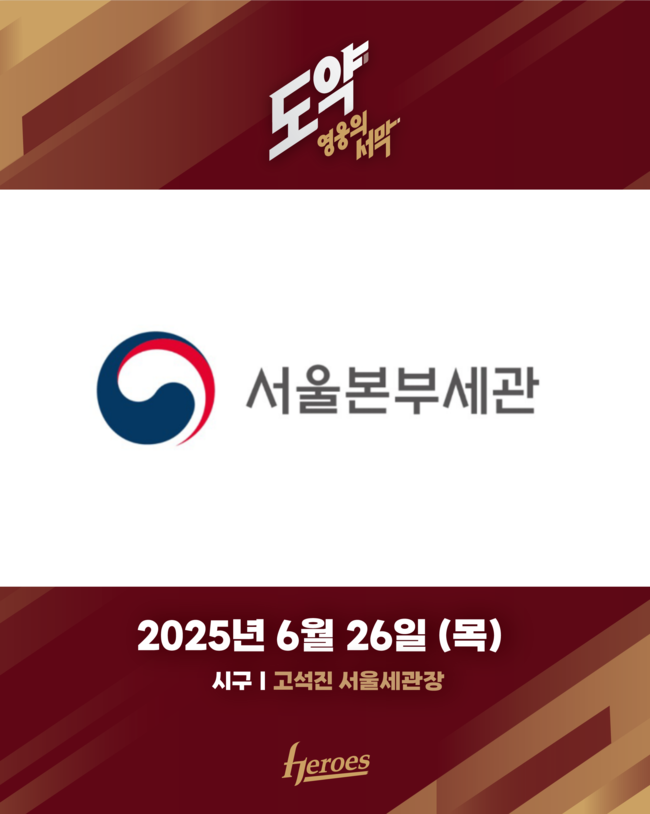 사진=키움 히어로즈 제공 프로야구 키움이 오는 26일 오후 6시 30분 서울 고척스카이돔에서 열리는 KIA타이거즈와 경기에 ‘세계마약퇴치의 날’ 기념 시구 행사를 가진다. 이날 고석진 서울본부세관장이 시구를 하고, 관세청 마약 탐지견 캐릭터 ‘마타’가 시타를 한다. 서울본부세관은 수도권 일대의 마약류 밀수입과 유통을 막기 위한 단속 업무를 전담하고 있다.