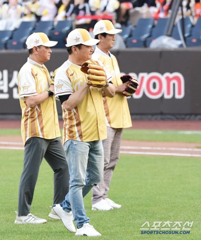 [포토] 올스타전 시구하는 한화 레전드 이강돈, 한희민, 김상국
