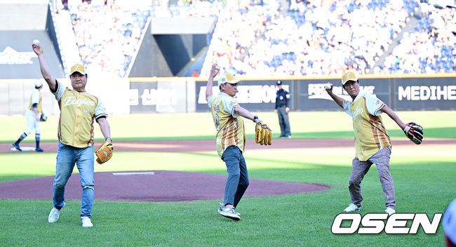 12일 오후 대전 한화생명볼파크에서 ‘2025 신한 SOL Bank KBO리그’ 올스타전이 열렸다. KBO 올스타전 경기는 드림 올스타와 나눔올스타 대표로 나선 총 30명의 선수가 치열한 승부를 펼친다. 이글스 레전드 이강돈-한희민-김상국이 시구를 하고 있다. 2025.07.12 / dreamer@osen.co.kr