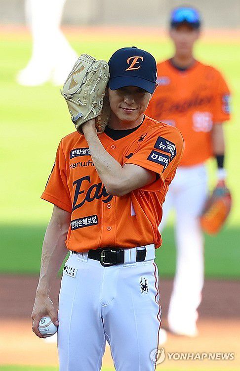 (대전=연합뉴스) 김도훈 기자 = 26일 대전 한화생명 볼파크에서 프로야구 2025 신한 SOL 뱅크 KBO리그 SSG 랜더스와 한화 이글스 경기에 앞서 배우 정성일이 시구 전 피치컴 신호를 듣는 포즈를 취하고 있다. 2025.7.26 superdoo82@yna.co.kr ▶제보는 카카오톡 okjebo ▶연합뉴스 앱 지금 바로 다운받기~ ▶네이버 연합뉴스