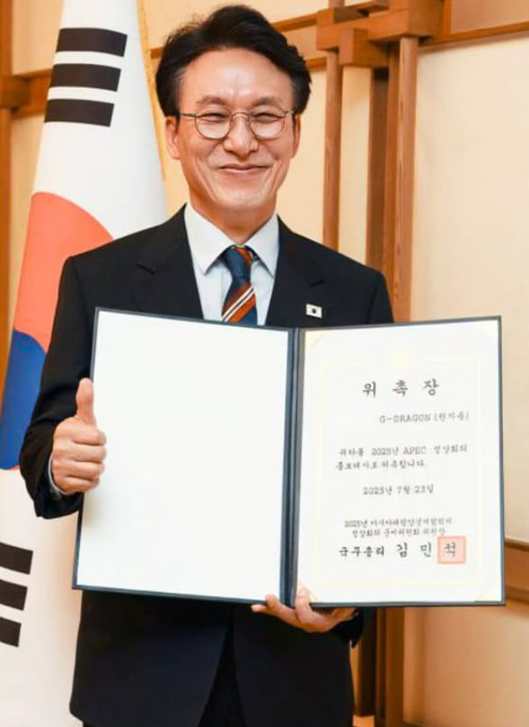 사진=김민석 총리 SNS 가수 지드래곤이 APEC 정상회의 홍보대사로 위촉됐다. 김민석 국무총리는 23일 자신의 인스타그램에 "APEC 정상회의 홍보대사를 소개합니다"라며 "국민 여러분께 기쁜 소식을 전한다. 대한민국 대표 아티스트이자 우주로 음원을 송출하는 등 끊임없는 창의와 혁신을 보여주고 있는 지드래곤 님을 2025년 경주 APEC 정상회의 홍보대사로