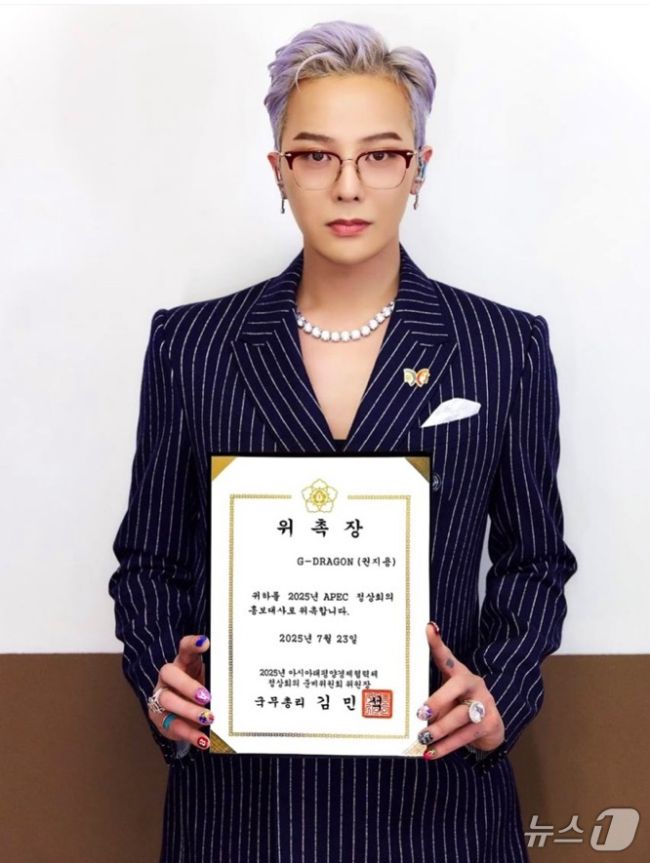 (서울=뉴스1) = 23일 김민석 국무총리가 가수 지드래곤을 경주 아시아태평양 경제협력체(APEC) 홍보대사로 위촉했다. 사진은 위촉장을 받은 지드래곤. (지드래곤 sns, 재판매 및 DB금지) 2025.7.23/뉴스1 psy5179@news1.kr Copyright ⓒ 뉴스1. All rights reserved. 무단 전재 및 재배포, AI학습 이용 금