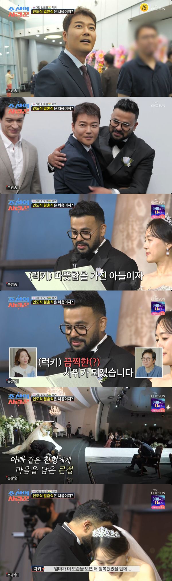 사진=TV조선 인도 출신 방송인 럭키가 결혼식에서 눈물을 쏟았다. 12일 방송된 TV조선 '조선의 사랑꾼'에는 럭키의 결혼식 현장이 공개됐다. 이날 다양한 국적의 하객들이 럭키의 결혼식을 찾았다. 결혼식 사회를 맡은 전현무는 "내 결혼식이면 좋겠다"며 "카메라가 거의 무슨 발리우드 스타네"라고 부러워했다. 그는 "결혼식 사회를 정말 많이 봤는데 이렇게 다양