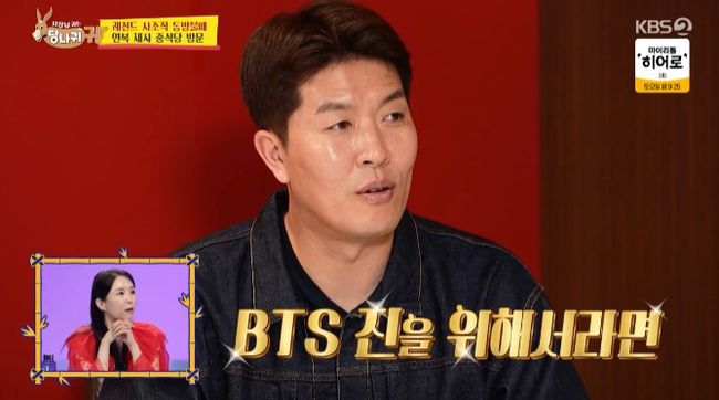 '버거킴' 김병현이 방탄소년단(BTS) 진을 향한 애정을 드러냈다. 4일 방송된 KBS2 '사장님 귀는 당나귀 귀'에서는 '동방불패 모임' 현장이 공개됐다. 앞서 각 분야에서 레전드로 자리잡은 이연복, 현정화, 김병현, 이천수는 '동방불패' 모임을 결성했던 바. 이날 이연복은 자신의 애제자가 운영하는 맛집으로 세 사람을 데려왔다. 그는 애제자인 왕병호 셰프
