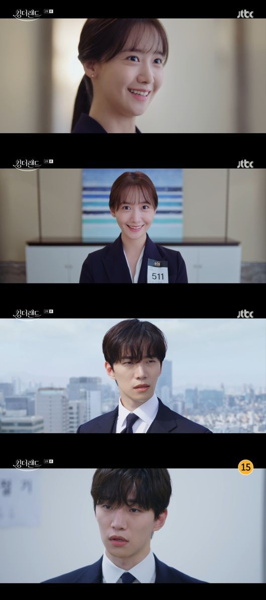 방송 화면 캡쳐 ‘킹더랜드’ 화장실을 참지 못한 임윤아가 이준호와 민망하게 다시 만나고 말았다. 17일 첫 방송된 JTBC 새 토일드라마 ‘킹더랜드’(극본 최롬(팀 하리마오), 연출 임현욱)에서는 구원(이준호)과 천사랑(임윤아)이 악연으로 만난 지 7년 만에 다시 만나게 되는 모습이 그려졌다. 지금으로부터 7년 전, 천사랑은 2년제 대학졸업자임에도 서류 심
