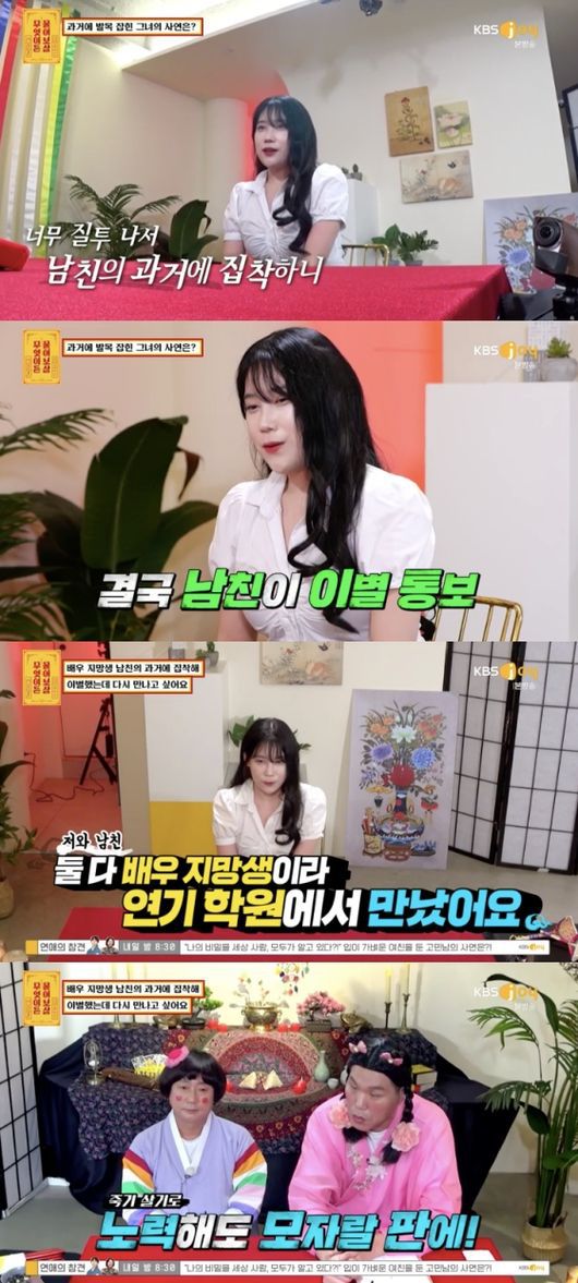 배우 지망생인 여성이 전 남자친구를 잊지 못해 힘들다는 고민을 털어놨다. 지난 25일 방송된 KBS Joy ‘무엇이든 물어보살’(이하 물어보살)에는 남자친구의 과거 연애사에 질투가 나 결국 이별했다는 사연자가 등장했다. 사연자는 남자친구의 과거 여자친구에게 질투가 나 집착을 하게 되었고 결국 남자친구는 이별을 고했다. 사연자는 남자친구와 재회하고 싶어 ‘물