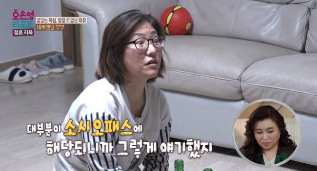 남편의 이기심을 주장하는 아내가 등장했다. 28일 방송된 MBC '오은영 리포트-결혼 지옥'(이하 '결혼지옥')에는 끝없는 오해와 의심이 이어지는 네버엔딩 부부가 등장했다. 이날 아내는 "남편의 성격과 소시오패스 성향이 다 일치하더라"며 "일반적으로 사람이 다 생각을 하고 사는데 그런 생각 자체를 아예 안 하는 어린아이 같은 느낌"이라고 주장했다. 네버엔딩