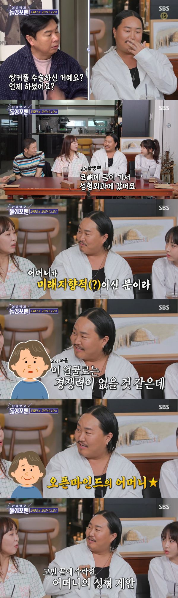 사진=SBS 가수 조째즈가 성형을 하게 된 이유를 밝혔다. 8일 방송된 SBS '신발 벗고 돌싱포맨'에는 정석용, 강예원, 정주리, 조째즈가 출연했다. 이날 조째즈는 성형 사실을 고백해 모두를 놀라게 했다. 그는 쌍꺼풀, 코, 이를 성형했다고 밝혔다. 조째즈는 "고등학교 때 축구를 하다가 코뼈에 금이 가서 성형외과에 갔다"며 "어머니와 같이 갔는데 어머니가
