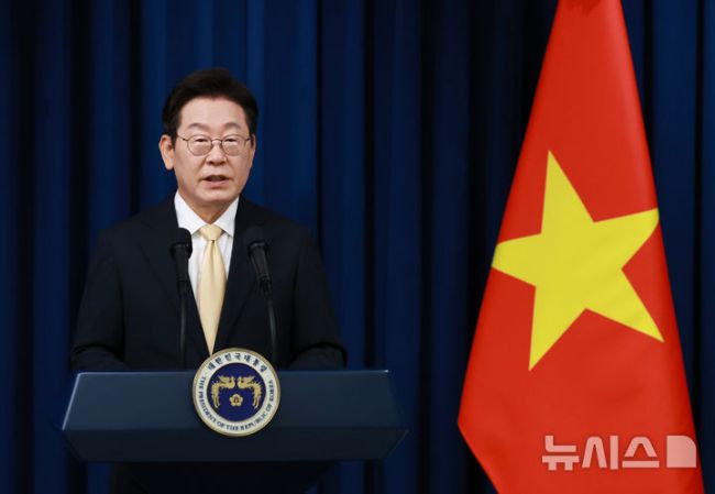 [서울=뉴시스] 고범준 기자 = 이재명 대통령이 11일 서울 용산 대통령실 청사에서 열린 한·베트남 공동언론발표에서 발언하고 있다. (대통령실통신사진기자단) 2025.08.11. bjko@newsis.com [서울=뉴시스]김경록 기자 = 이재명 대통령과 또 럼 베트남 공산당 서기장은 11일 오전 용산 대통령실에서 소인수회담과 확대회담을 잇따라 진행한 후 정