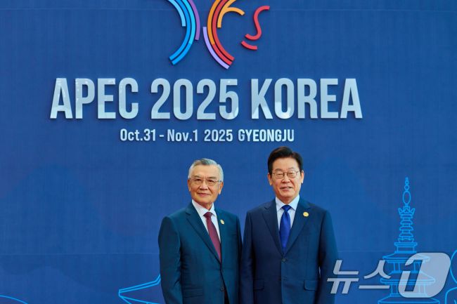(서울=뉴스1) 허경 기자 = 이재명 대통령이 31일 경북 경주화백컨벤션센터(HICO)에서 열린 2025 아시아태평양경제협력체(APEC) 정상회의에서 린신이 대만 총통 선임고문을 맞이하고 있다. (대통령실 제공. 재판매 및 DB 금지) 2025.10.31/뉴스1 neohk@news1.kr Copyright ⓒ 뉴스1. All rights reserved.