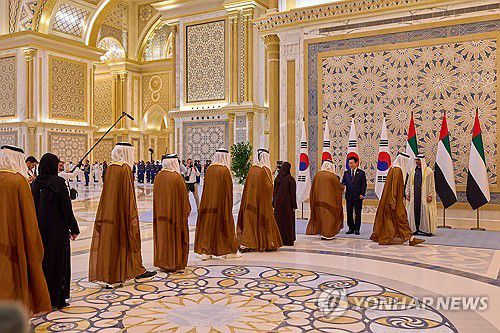 (아부다비=연합뉴스) 김도훈 기자 = 이재명 대통령이 18일(현지시간) 아랍에미리트(UAE) 아부다비 대통령궁에서 열린 국빈방문 공식 환영식에서 참석자들과 인사하고 있다. 2025.11.18 [공동취재 제공. 재판매 및 DB 금지] superdoo82@yna.co.kr ▶제보는 카카오톡 okjebo ▶연합뉴스 앱 지금 바로 다운받기~ ▶네이버 연합뉴스 채널