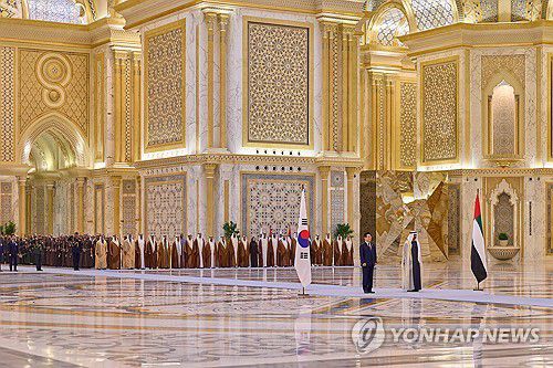 (아부다비=연합뉴스) 김도훈 기자 = 이재명 대통령과 무함마드 빈 자이드 알 나흐얀 아랍에미리트(UAE) 대통령이 18일(현지시간) 아부다비 대통령궁에서 열린 국빈방문 공식 환영식에 참석해 있다. 2025.11.18 [공동취재 제공. 재판매 및 DB 금지] superdoo82@yna.co.kr ▶제보는 카카오톡 okjebo ▶연합뉴스 앱 지금 바로 다운받기