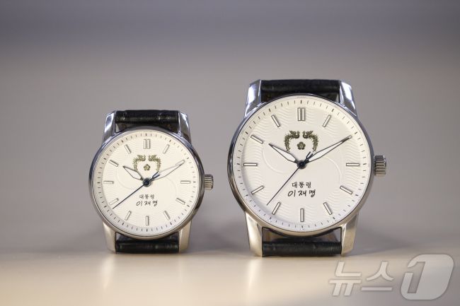 대통령실은 5일 서울 용산 대통령실 청사에서 강유정 대변인 브리핑을 통해 이재명 대통령 기념 손목시계를 공개했다. 사진은 왼쪽은 여성용, 오른쪽은 남성용 이 대통령 기념 손목시계. (대통령실 제공. 재판매 및 DB 금지) ⓒ News1 이재명 기자 (서울=뉴스1) 한재준 한병찬 기자 = 이재명 대통령 취임 6개월을 맞아 5일 대통령 손목시계가 공개됐다. 강