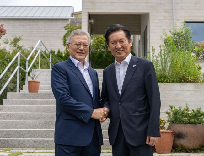 [서울=뉴시스] 문재인 전 대통령이 지난해 8월 7일 경남 양산시 평산마을 사저에서 정청래 더불어민주당 대표와 기념촬영하고 있다.(사진=더불어민주당 제공) 2025.08.07. photo@newsis.com *재판매 및 DB 금지 [서울·양산=뉴시스] 이창환 한재혁 기자 = 정청래 더불어민주당 대표는 1일 문재인 전 대통령을 만나 "전임 대통령으로서 여러
