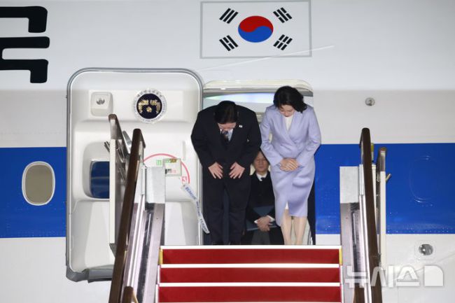 [성남=뉴시스] 최동준 기자 = 중국 국빈 방문 일정을 마친 이재명 대통령과 김혜경 여사가 7일 경기 성남 서울공항에 도착해 공군 1호기에서 내리며 인사하고 있다. 2026.01.07. photocdj@newsis.com [사진 영상 제보받습니다] 공감언론 뉴시스가 독자 여러분의 소중한 제보를 기다립니다. 뉴스 가치나 화제성이 있다고 판단되는 사진 또는 영